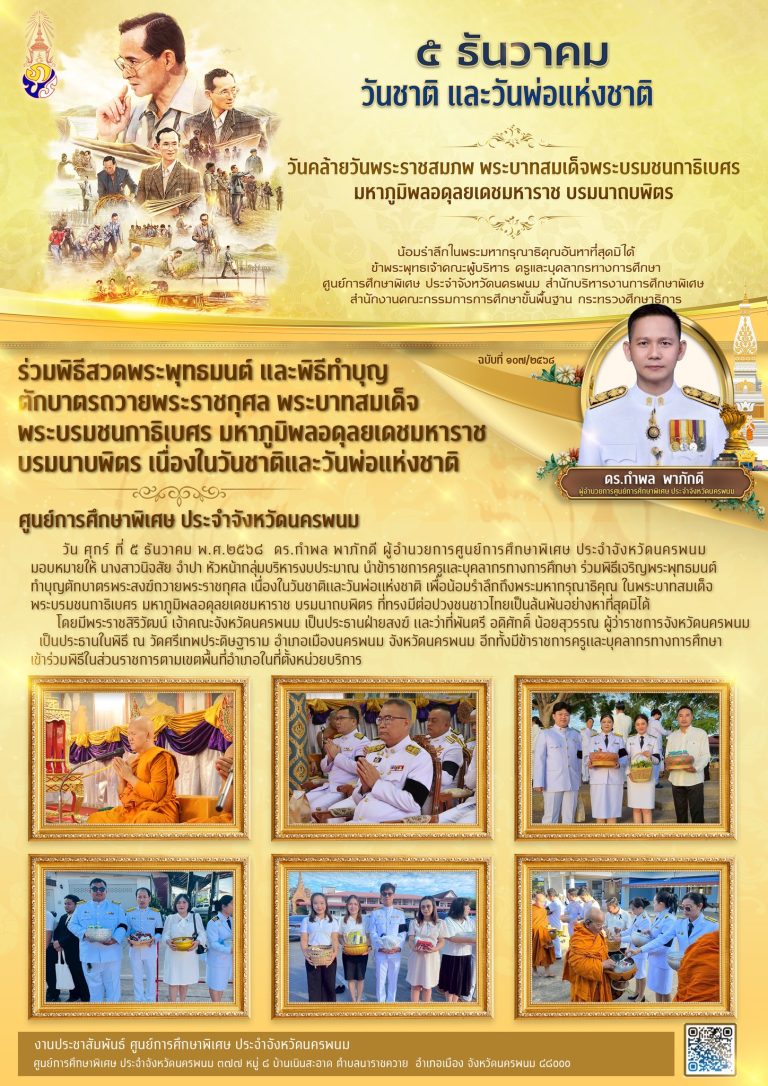 วัน ศุกร์ ที่ ๕ ธันวาคม พ.ศ.๒๕๖๘ ดร.กำพล พาภักดี ผู้อำนวยการศูนย์การศึกษาพิเศษ ประจำจังหวัดนครพนม มอบหมายให้ นางสาวนิจสัย จำปา หัวหน้ากลุ่มบริหารงบประมาณ นำข้าราชการครูและบุคลากรทางการศึกษา ร่วมพิธีเจริญพระพุทธมนต์ ทำบุญตักบาตรพระสงฆ์ถวายพระราชกุศล เนื่องในวันชาติและวันพ่อแห่งชาติ เพื่อน้อมรำลึกถึงพระมหากรุณาธิคุณ ในพระบาทสมเด็จ พระบรมชนกาธิเบศร มหาภูมิพลอดุลยเดชมหาราช บรมนาถบพิตร ที่ทรงมีต่อปวงชนชาวไทยเป็นล้นพ้นอย่างหาที่สุดมิได้