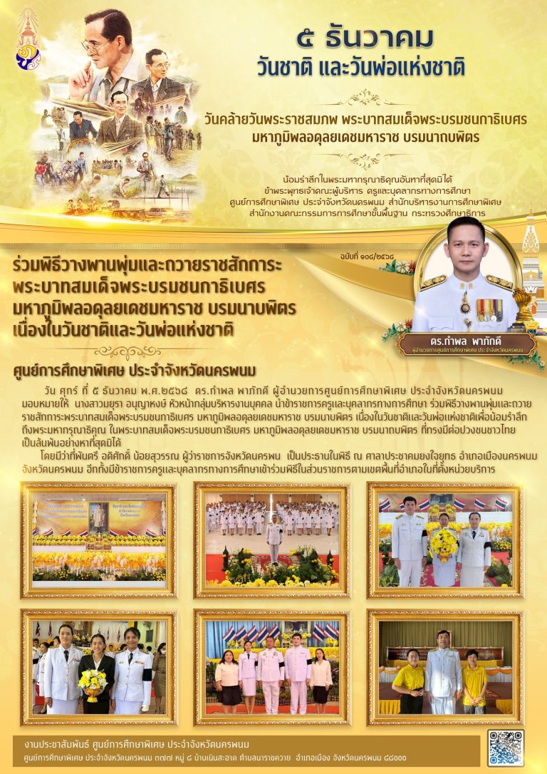 วัน ศุกร์ ที่ ๕ ธันวาคม พ.ศ.๒๕๖๘ ดร.กำพล พาภักดี ผู้อำนวยการศูนย์การศึกษาพิเศษ ประจำจังหวัดนครพนม มอบหมายให้ นางสาวมยุรา อนุญาหงษ์ หัวหน้ากลุ่มบริหารงานบุคคล นำข้าราชการครูและบุคลากรทางการศึกษา ร่วมพิธีวางพานพุ่มและถวายราชสักการะพระบาทสมเด็จพระบรมชนกาธิเบศร มหาภูมิพลอดุลยเดชมหาราช บรมนาบพิตร เนื่องในวันชาติและวันพ่อแห่งชาติเพื่อน้อมรำลึกถึงพระมหากรุณาธิคุณ ในพระบาทสมเด็จพระบรมชนกาธิเบศร มหาภูมิพลอดุลยเดชมหาราช บรมนาถบพิตร ที่ทรงมีต่อปวงชนชาวไทยเป็นล้นพ้นอย่างหาที่สุดมิได้
