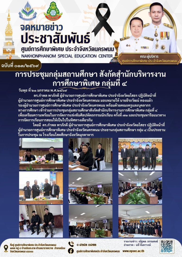 วันอังคาร ที่ ๒๐ มกราคม พ.ศ.๒๕๖๙ ดร.กำพล พาภักดี ผู้อำนวยการศูนย์การศึกษาพิเศษ ประจำจังหวัดยโสธร ปฏิบัติหน้าที่ผู้อำนวยการศูนย์การศึกษาพิเศษ ประจำจังหวัดนครพนม มอบหมายให้ นายธีระวัฒน์ ทองแผ้ว รองผู้อำนวยการศูนย์การศึกษาพิเศษ ประจำจังหวัดนครพนม พร้อมด้วยคณะครูและบุคลากรทางการศึกษา เข้าร่วมการประชุมกลุ่มสถานศึกษาสังกัดสำนักบริหารงานการศึกษาพิเศษ กลุ่มที่ ๔ เพื่อเตรียมความพร้อมในการจัดการแข่งขันศิลปหัตถกรรมนักเรียน ครั้งที่ ๗๓ และประชุมหารือแนวทางการจัดการเรียนการสอนให้เป็นไปในทิศทางเดียวกัน